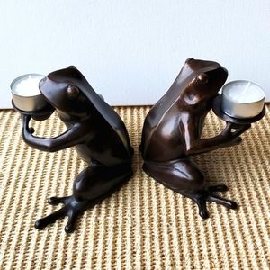 Fantastic pair of frog bronze metal very heavy candleholders or you can use as bookends. They are in excellent condition just some tiny scratches around the ring where the tapers go in.