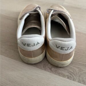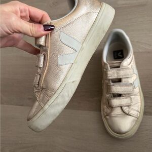 Stylish and comfortable rose gold shoes featuring easy-to-use Velcro straps. Perfect for everyday wear.