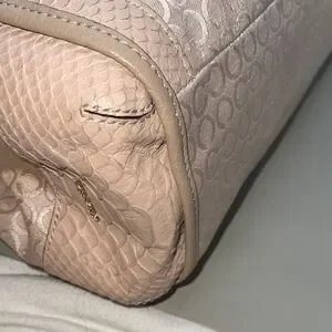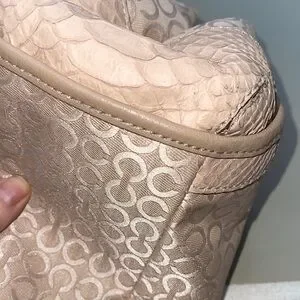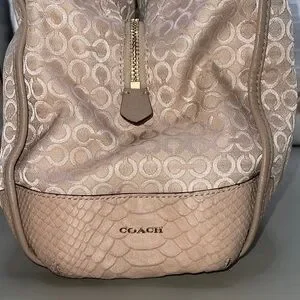 This elegant Coach beige bag features a stylish design perfect for any occasion. The handbag is the Coach Madison Op Art Pearl Phoebe. Pearlescent signature “Op Art” jacquard fabric with a python-embossed trim. Bag offers a 3 section shoulder bag with a magnetic closure and gold tone hardware.The subtle pattern adds a touch of sophistication. Ideal for daily use or special events.