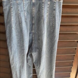 Chic light blue denim jumpsuit. Features short sleeves and front pockets. Ideal for everyday wear.