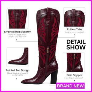 Pointed Toe Cowboy Boots Chunky Heel Knee High Western Boots Butterfly