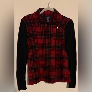 Chaps zip up sweater with a bold red and black checkered pattern. Size small. Perfect for layering.