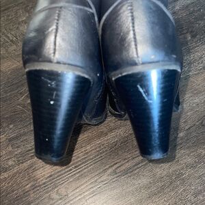 Step out in style with these sleek black ankle boots. Perfect for any occasion. No brand. Signs of minimal wear on heels and scuff on one toe.