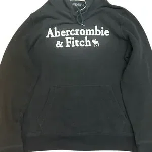 Classic Abercrombie & Fitch pullover hoodie crafted from their signature soft A&F fleece. This black sweatshirt features a bold white applique logo across the chest with the iconic moose emblem. Designed with a cozy waffle-lined hood, adjustable drawstrings, and a spacious kangaroo front pocket, it offers a timeless casual look with a comfortable, relaxed fit.