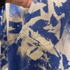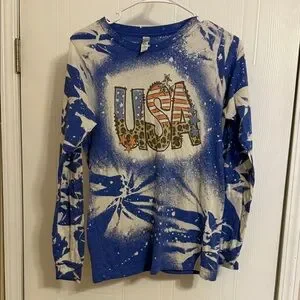 Eye-catching long sleeve tee with bold USA graphic. Blue and white tie-dye effect. Ideal for casual outings.