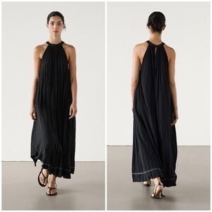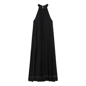 A black midi-length dress featuring a halter neck and a pleated fabrication that provides texture and movement.