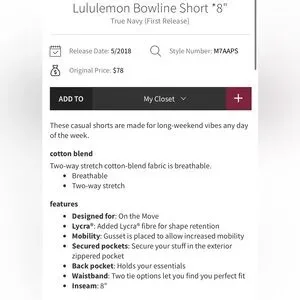 Lululemon Men’s Bowline True Navy Short 8” Medium