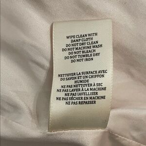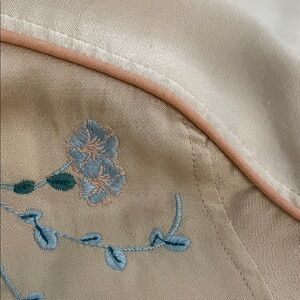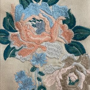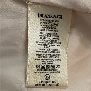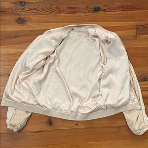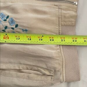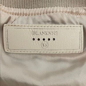 Cream, beige, floral embroidered, satin, bomber jacket by Blank NYC in a women's size extra small. Full zip. Side pockets. Embroidered on front and back. Rib knit at neck, waist and cuffs. Fully lined. Approximate measurements shown in photos. There is a pull on the backside on of one sleeve and a very faint discolored area on the backside. See photos. Neither are very noticeable. Super cute jacket perfect for spring and fall. In good pre-owned condition with some signs of wear from normal use.