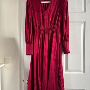 This gorgeous pure silk dress from LilySilk is in excellent condition. It's a gorgeous deep red wine color. There are so many lovely details, from the tiny ruffles at the tops and bottoms of the sleeves and around the neck, the cloth covered buttons on the cuffs, and the tasteful V-neckline. The waist is elastic, so it's super comfy as well as beautiful. It's machine washable and can be easily de-wrinkled with a cool iron or light steam, so no need to worry about dry cleaning fees. It's in excellent condition. I've only worn it a few times. I can't find any rips or stains, and it comes from a smoke-free home. I love this dress, but it's sadly just a tad too big for me. Give it a great home today.