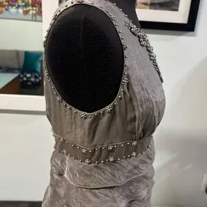 A gorgeous chic platinum midi dress with embellished neckline. Features tiered layers for added elegance. Back has zipper, slit and top button. Lined.