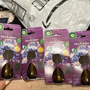 Air Wick Essential Mist in Black Lotus & Violet scent. Includes four packs. Perfect for a refreshing aroma.