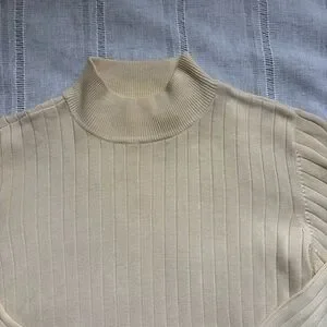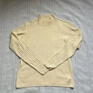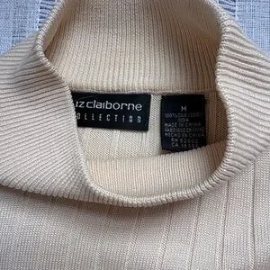 Liz Claiborne Silk Ivory Ribbed Turtleneck Sweater. Size medium. 100% silk. This sweater blouse is characterized as a "quiet luxury" or classic vintage staple, often appearing in 90s-era collections. It is known for a soft, comfortable feel and a fitted silhouette, making it versatile for layering under blazers or wearing alone.