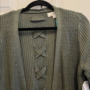 Stay cozy and stylish with this elegant green sweater cardigan. Perfect for layering, it adds a touch of sophistication to any outfit.Back has shoelace look, waffle texture