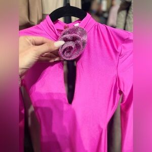 Striking Giuseppe Di Morabito mini dress in vibrant fuchsia pink featuring a high neckline, front cut-out, and signature floral hardware detail. Designed to sculpt and flatter with a bold, confident silhouette.