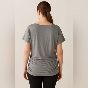 This soft and stretchy tee features a relaxed fit with flattering side ruching and a wide scoop neckline. Perfect for pairing with jeans, leggings, or skirts for an easy, everyday style that still feels polished.