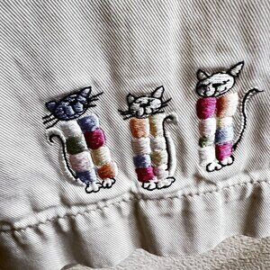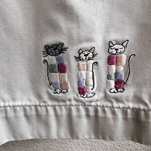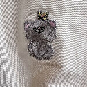 These cropped pants feature whimsical cat embroidery, a neutral beige hue, and soft cotton fabric. Designed for comfort and subtle style in casual settings.