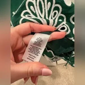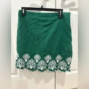 Stylish green skirt featuring elegant white embroidery at the hem. Perfect for casual outings. Size 6 has a couple loose threads but no holes or stains.