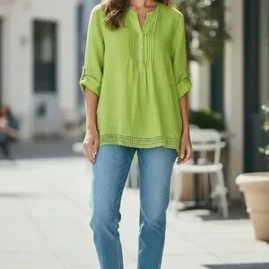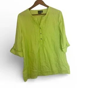 The Rafaella Women's Lime Green Linen Lagenlook V-Neck Tunic Top is a stylish and comfortable piece perfect for the beach, summer parties, or casual outings. Made from 100% Irish linen, this lightweight and breathable top features a V-neck and 3/4 roll tab sleeves, with a pullover style that is easy to wear. The solid green color and crochet accents add a touch of bohemian flair, while the size L offers a regular fit for a flattering silhouette. Perfect for the season of summer, fall, and spring, this tunic top from Rafaella is a versatile and chic addition to any woman's wardrobe.
