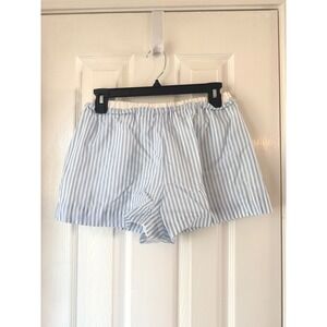 Lightweight cotton-blend boxer style shorts feature a classic blue and white vertical stripe pattern. Designed with a comfortable pull-on elastic waistband and adjustable front ties, these shorts include practical side-seam pockets at the hips. The breezy silhouette and coastal aesthetic make them ideal for casual summer wear or lounging.