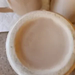 Set of 7 vintage mugs. Tan in color. 2 have cracks but do not leak. 8 oz. capacity. Cross posted.