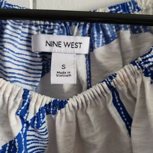 Beautiful Nine West crop top in size Small featuring a bold blue and white abstract print. Designed with a flattering off-the-shoulder neckline and statement balloon sleeves for a trendy, feminine look. Lightweight fabric with a flowy fit that’s perfect for spring and summer.