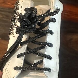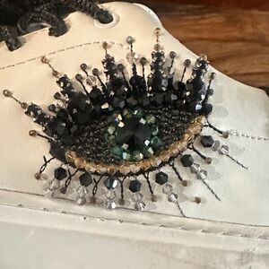 Trendy white sneakers with a striking black and green eye embellishment. Custom glitter laces. Perfect for adding flair to any outfit. Gently worn, have not attempted to clean soles.