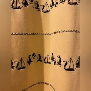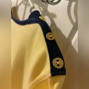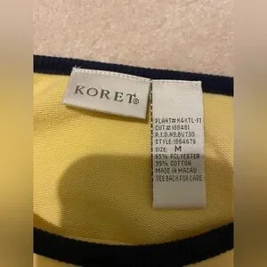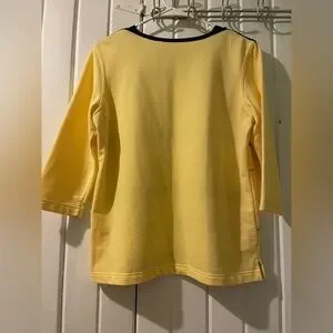 EUC-like new. Only worn once or twice. Size medium Koret yellow knit top with 3/4 sleeves. Lots of navy embroidered sailboats and embellishments. Buttons on shoulders for added embellishment. Armpit to armpit 20” and centerback length 23”. Tote 17.