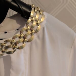 This elegant white blouse features a stunning gold-accented neckline, perfect for adding a touch of sophistication to any outfit. Ideal for both casual and formal occasions.