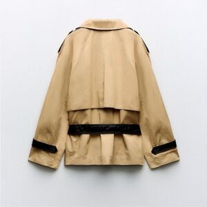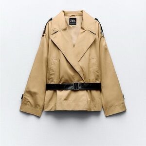 Stylish tan trench coat. Features a black belt. Perfect for layering.