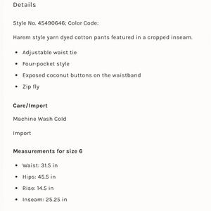 Lovely pants from Free People, size 6. May also work for size 8. High rise, flattering wide waistband. Harem style with coconut button closure, zipper fly, and removable tie belt. On-seam front pockets, back pockets with coconut button closure. Embroidered jacquard stripe detail. These are incredible! A few loose strings, only light wear. Very good condition!