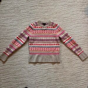 J.Crew multicolor wool fairisle sweater - bright holiday Nordic look, 100% wool from 2016 (can we go back to these fun bright colors??). Marked size medium, but see measurements in photos and close-ups of knit - I believe this was slightly shrunk and slightly felted in the wash and now fits a size small. I think it's beautiful and wearable, but want to be transparent! Sweater has a gray base with red, pink, white, blue, and orange pattern.