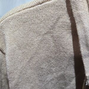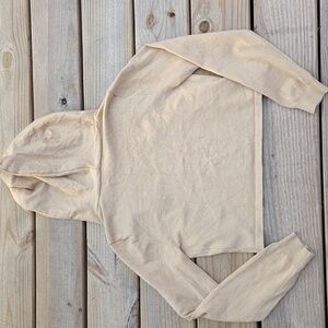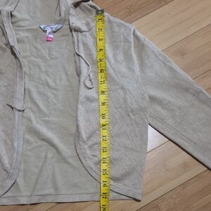 No Boundaries size L(11-13) cropped cardigan with hood and drawstrings. It has a nice stretch to it but it is very lightweight. Tan but it has a nice sheen to it. There's a couple small blemishes(see photos) and light pilling. Perfect for a gym or dance cover up.