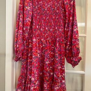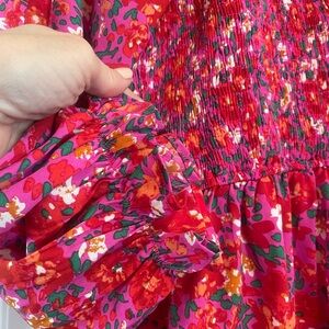 New with tags Large JODIFL fuschia floral smocked ruffle dress with elastic ruffle sleeve cuffs. Chic floral dress with vibrant pink and red hues. Features a flowy stylish design by JODIFL.