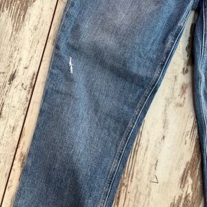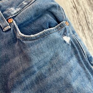 Paige Sarah Slim jeans, high waisted straight leg, light wash distressed denim, Paige size 27 jeans, premium slim straight, ankle length denim, high rise slim fit, designer light blue jeans, comfortable stretch denim, Paige denim Sarah.
