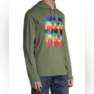 Stylish Polo Ralph Lauren lightweight hoodie in a versatile olive green tone featuring a bold multicolor POLO graphic at the chest. Comfortable everyday piece with a modern streetwear vibe — perfect layered or worn solo.