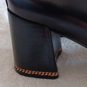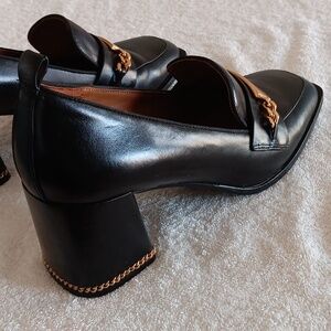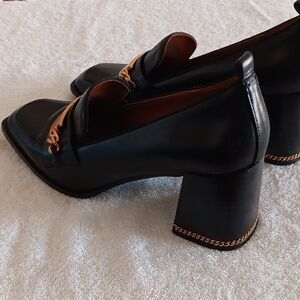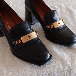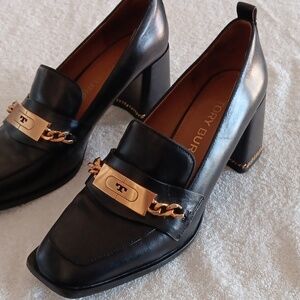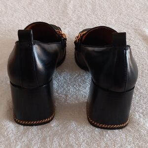 In great pre loved condition and gently worn. Tory Burch leather heeled loafers in size 9. Perfect Black colorway with gold Tory Burch hardware including chain wrapped heel. Soft cushioned footbed, all leather materials, approximately 3" chunky heel. $385.00 new