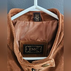 Beautiful EMC brown suede jacket featuring a structured moto-inspired silhouette with detailed stitching and utility pockets. Rich caramel tone suede gives it a timeless, heritage look — perfect for fall layering or everyday wear.