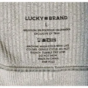 The Lucky Brand Seamless Soft Ribbed Sports Bra in Grey is a versatile and comfortable activewear essential. This wireless bra with wide straps and a pullover closure provides medium support, making it suitable for activities like yoga or athleisure. Made from a nylon blend with spandex, the knit fabric offers a seamless and soft feel. The size L bra is machine washable and features a solid gray color, perfect for everyday wear. It has holes on the inside for pads but it does not come with any bra pads.
