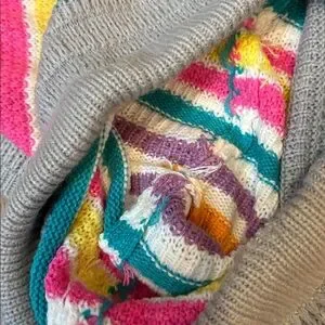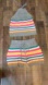 Pink , teal , purple , orange , yellow & cream stripes w gray color block at edges of both pieces