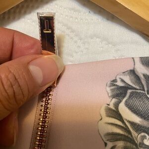 Chic dress with vibrant floral design. Features pink and gray chevron pattern.