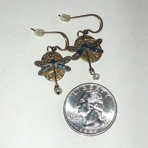 Elegant dragonfly dangle earrings featuring intricate blue and brass color aged metal detailing. Perfect for adding a touch of nature-inspired charm to any outfit.