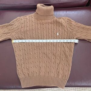 Classic brown turtleneck with cable knit pattern. Features Ralph Lauren logo. Perfect for warmth and style.