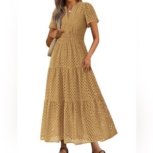 Step out in style with this elegant tan eyelet dress. Perfect for any occasion, this dress combines comfort and fashion effortlessly.