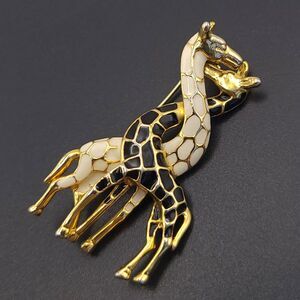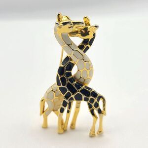 Vintage 80s Gold Tone Intertwined Giraffes Black & White Enamel Brooch Pin Retro