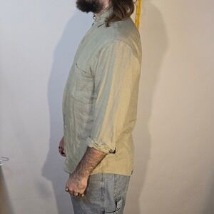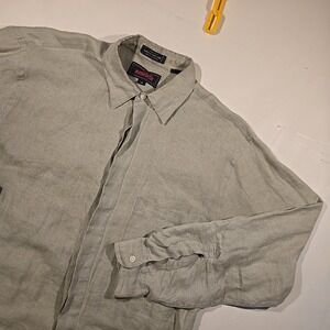 VTG Montebello pure linen long sleeve button front shirt tagged M but fits like XL in sage green/brown, single chest pocket, made in Hong Kong with Irish woven fabric, relaxed fit, Measurements in photos.