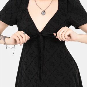 Chic black maxi dress with floral rose detail. V-neckline and short sleeves. Light and airy cotton blend. Perfect for stylish outings.