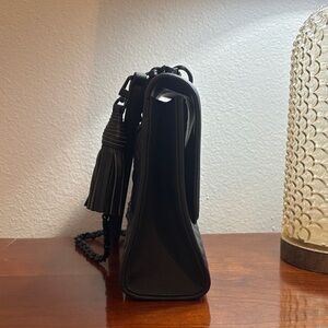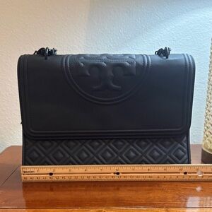 Elegant black crossbody bag. Features quilted design. Iconic Tory Burch logo.