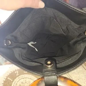 This stylish black tote bag features a unique tortoiseshell handle, perfect for adding a touch of elegance to any outfit. Ideal for everyday use, this bag combines functionality with chic design.