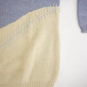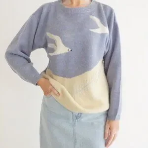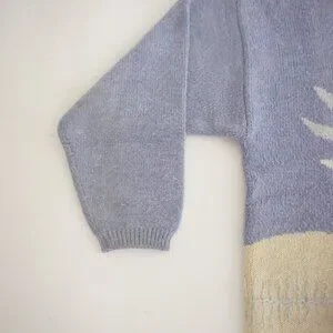 The knit blend offers a smooth, lightly fuzzy texture with comfortable structure through the ribbed neckline, cuffs, and hem. The scenic color blocking across the lower half grounds the design and gives it a balanced composition. The crew neckline keeps it classic and easy to layer over denim, trousers, or skirts. It pairs especially well with light wash denim for a relaxed, breezy look that feels timeless.
