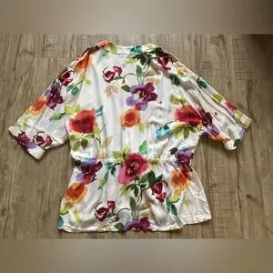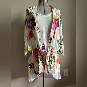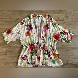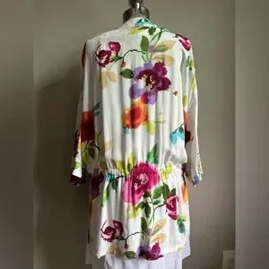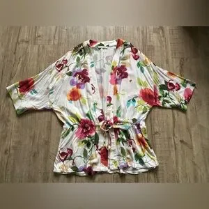 Vibrant floral kimono with a tie belt. Features a mix of red, pink, and green flowers on a white background.